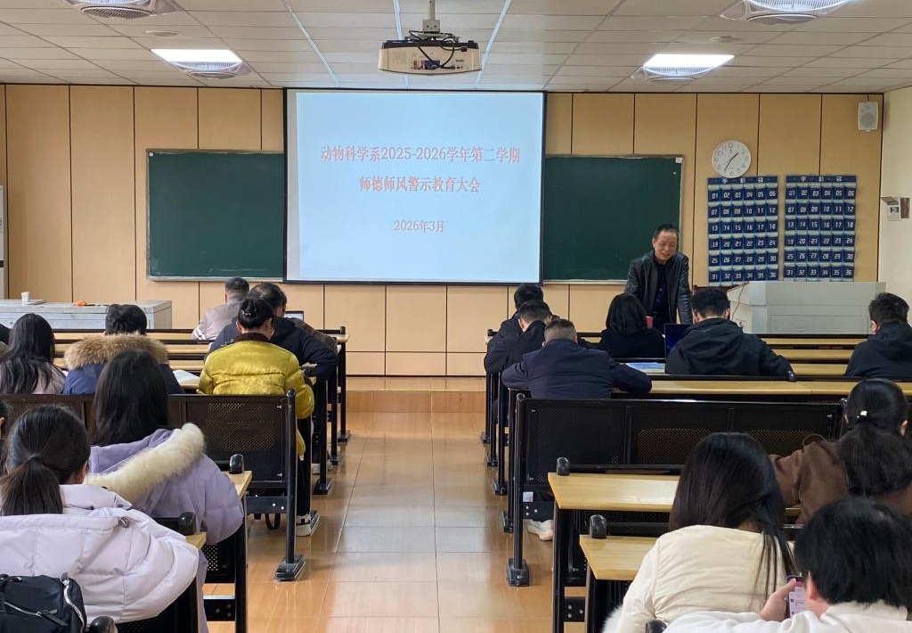 为进一步加强教师队伍建设,提升教师职业道德素养,筑牢立德树人根基。近日,动物科学系在博学楼300教室召开了本学期第一次师德师风警示教育大会。全系90余位专兼职教师参加了此次会议。