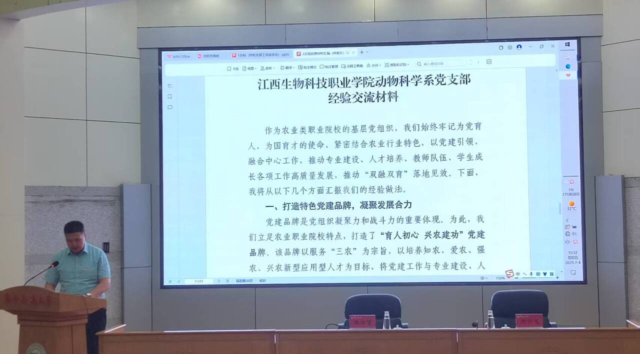 7月4日,全省高校“党建联盟”行动经验交流暨第五批全国党建“双创”申报工作座谈会在华东交通大学举行。动物科学系党支部桂智文同志作为代表,在会上作了题为《着力打造特色党建品牌 引领农职院校高质量发展》的交流发言,详细介绍了我院教师党支部成功创建“全国党建工作样板支部”的实践探索与宝贵经验。