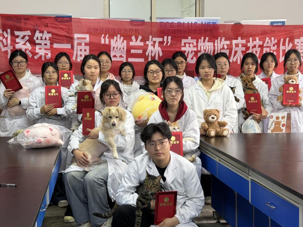 为锤炼动科学子宠物临床实操能力,夯实专业技能基础,第一届“幽兰杯”宠物临床技能大赛于2025年12月12日在实验楼103教室成功举行,动科系团总支书记、副书记、评委老师、参赛选手共50余人参与此次决赛。